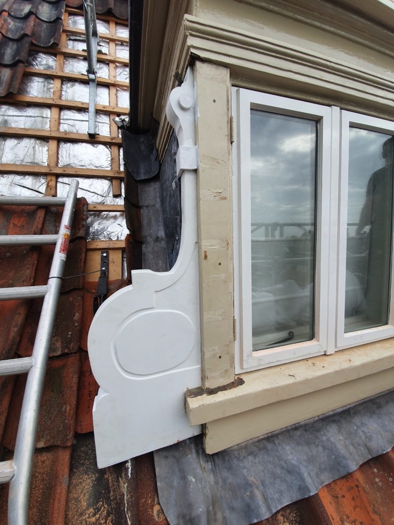 Wij herstellen waar nodig en restaureren complete gevelelementen zoals kozijnen, boeidelen, sierlijsten, luiken en dakkapel-oren.